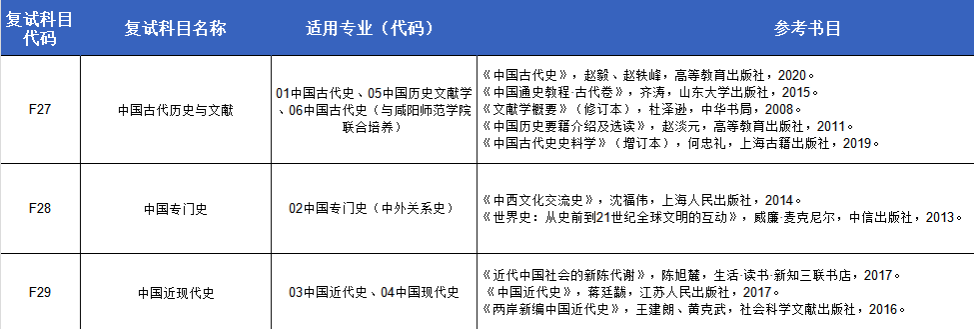 中国史各方向主要考核中国史各领域的基本内容、研究理念与方法、研究现状等问题。各方向参考书目如下:
